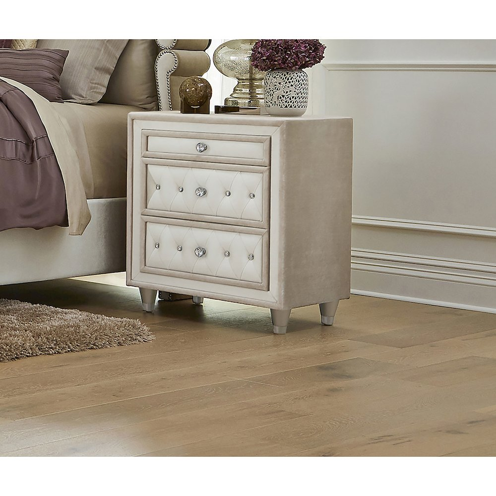 With French Provincial decor in mind, this upholstered nightstand has everything you need for an elegant bedroom. It's a three-drawer nightstand that offers storage space for small bedside essentials. Beautiful button tufting on the drawers is enhanced with crystal-like buttons. Tapered legs add yet another elegant touch to this ivory and camel nightstand. Place it by your bed and watch your sleeping space instantly transform.