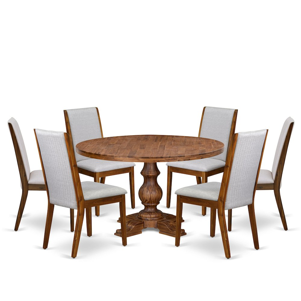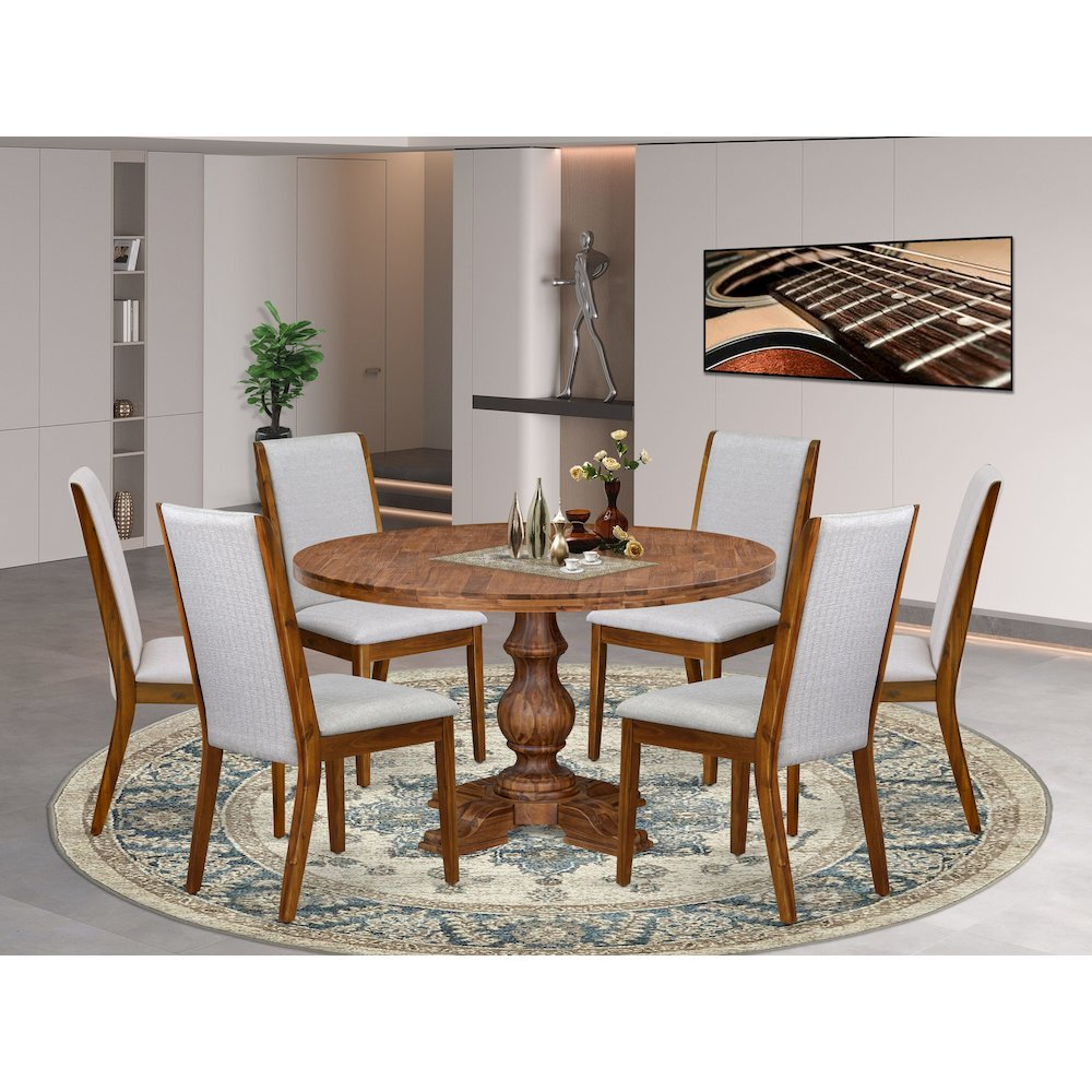 The Luxe by East West Furniture combines style, comfort, and expert craftsmanship in a versatile design that complements a variety of tastes and lifestyles. This 7-piece mid-century kitchen table set pairs functionality and elegance, featuring a durable round dining table and 6 finely parson dining chairs. Its modern sophistication enhances your dining space, creating a stylish atmosphere. The dining room chairs are upholstered in soft grey linen fabric with antique walnut legs, adding a refined, cozy touch. The antique walnut tabletop, supported by a robust pedestal base, exudes timeless appeal. Blending classic and contemporary elements, this dining table set is ideal for casual meals and formal gatherings, making it a striking focal point in any dining area. Made from high-quality rubberwood, the spacious breakfast table is both durable and stylish, perfect for everyday dining and special occasions. Coordinated rubberwood components create a cohesive look that enriches your space’s visual charm while ensuring durability and easy upkeep. The high-back chairs feature soft linen upholstery, emphasizing comfort and elegance. Designed for both dining and living areas, these upholstered dining chairs provide a supportive, inviting seating experience, elevating the ambiance of your space with a chic, welcoming feel.