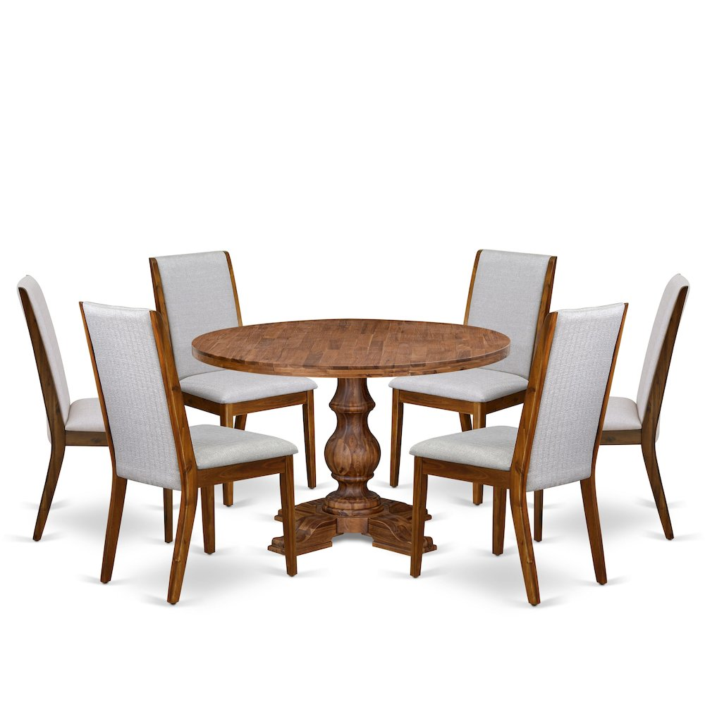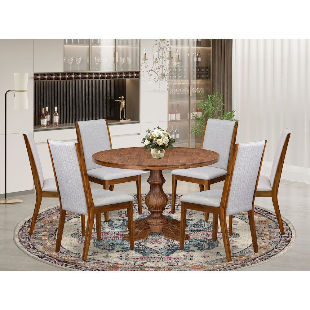 The Luxe by East West Furniture embodies a seamless blend of style, comfort, and exceptional craftsmanship, catering to diverse tastes and lifestyles. This 7-piece modern dining table set combines functionality with elegance, featuring a robust wooden dinner table paired with 6 exquisitely designed upholstered dining chairs. Its modern aesthetic enhances any dining space, fostering a warm and inviting atmosphere. The parson dining chairs are upholstered in soft grey linen fabric, and supported by antique walnut legs, adding a touch of sophistication. The antique walnut tabletop, anchored by a sturdy pedestal base, radiates timeless charm. This dining set skillfully merges classic and contemporary elements, making it perfect for casual meals and formal gatherings alike, serving as a striking centerpiece. Crafted from high-quality rubberwood, the spacious kitchen table ensures durability and style, ideal for both everyday dining and special occasions. The coordinated rubberwood components not only enhance the visual appeal of your space but also guarantee longevity and ease of maintenance. The high-back chairs, upholstered in plush linen fabric, emphasize comfort and sophistication, making them suitable for both dining and living areas, providing supportive seating that enriches your environment with a chic and welcoming vibe.