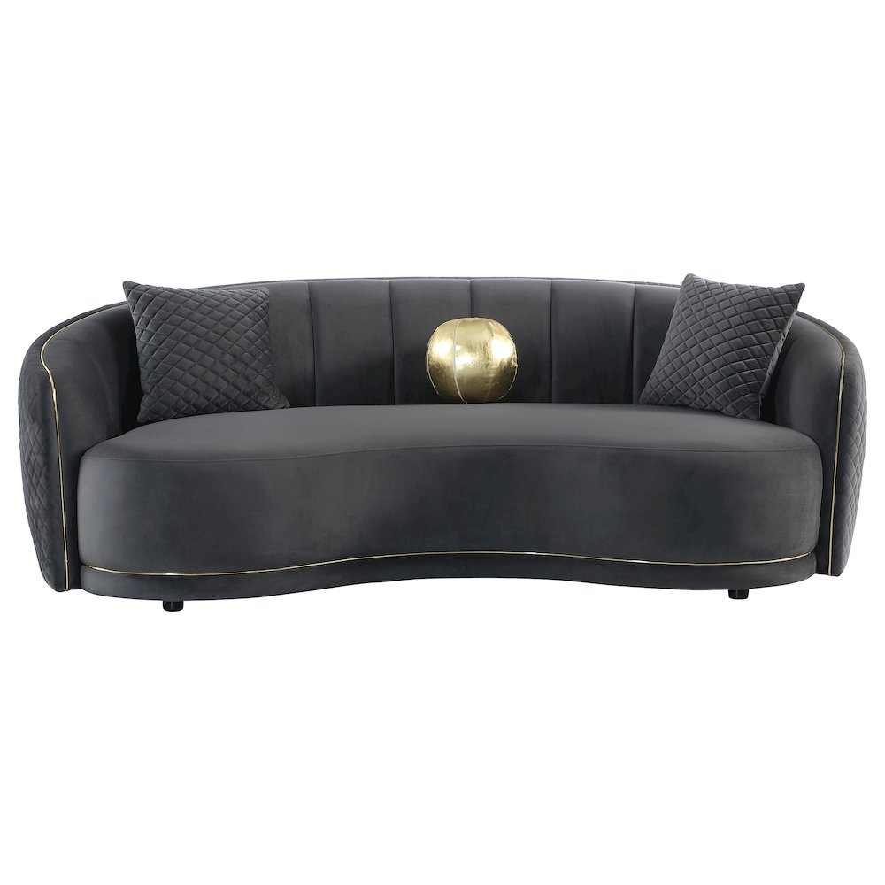 Put a sophisticated spin on living room decor with a modern two-piece sofa and loveseat set. Designed to impress, each piece boasts dark grey upholstery that's velvety soft and trimmed in gold that adds metallic gleam and warm contrast. The gentle curvature of the sofa and loveseat silhouettes bring elegant flair to your living room. The outer surface of the back and arms adds diamond texturing, while vertical channel tufting adds dimension to the interior of each piece. The sofa adds a gold ball accent pillow and two in matching grey, while the loveseat includes two pillows in grey for added comfort.