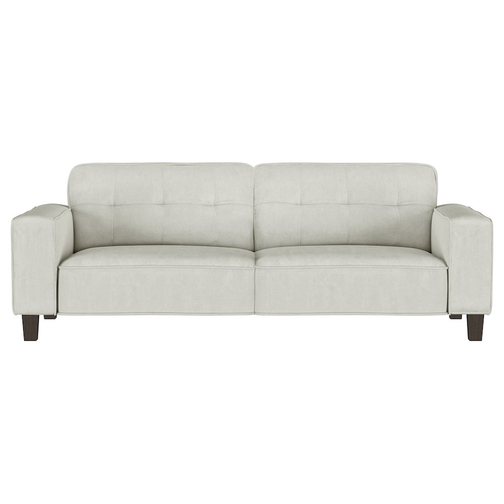 Hints of mid-century character infuse charm into a three-piece modern sofa set Plush back cushions are tufted to create a sense of depth and dimension in your living room Inviting upholstery and plush foam cushions create incredible comfort for lounging or entertaining Timeless silhouette features tapering dark brown finished wooden legs and wide, straight track arms Sinuous spring decking supports seats and back for incredible comfort and support that lasts