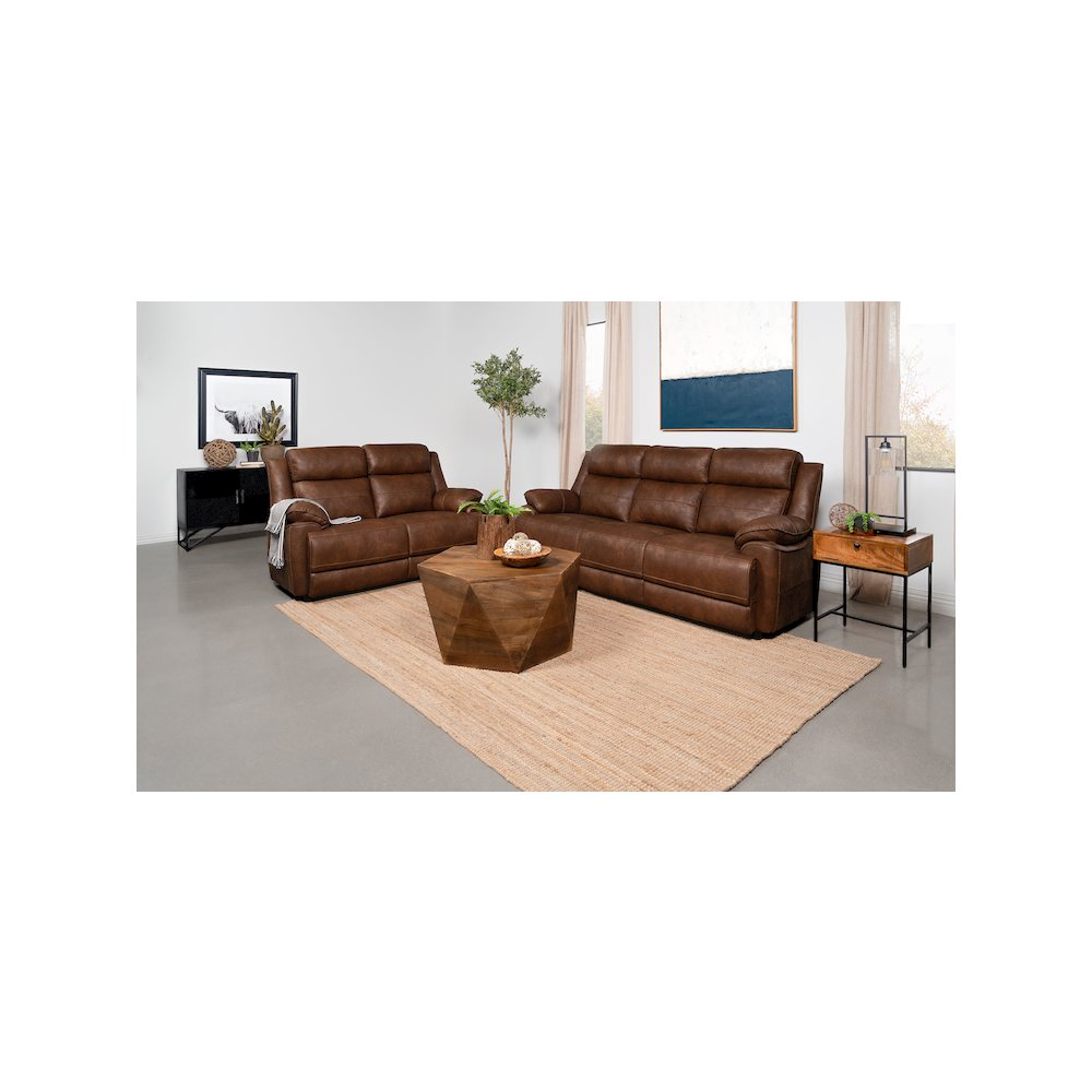 Rich brown faux leather is smooth and timeless, lending inviting style to your living area Extra-plush foam cushions and pillowtop arms provide excellent comfort and relaxation Seats include pocket coil springs and sinuous spring decking Back includes webbed decking support Stationary sofa and loveseat design with a relaxed look and feel in any living area