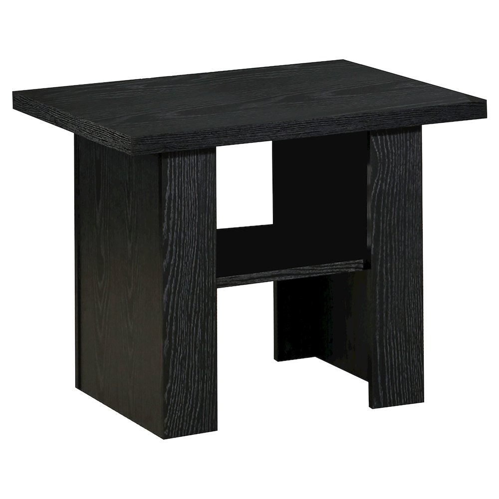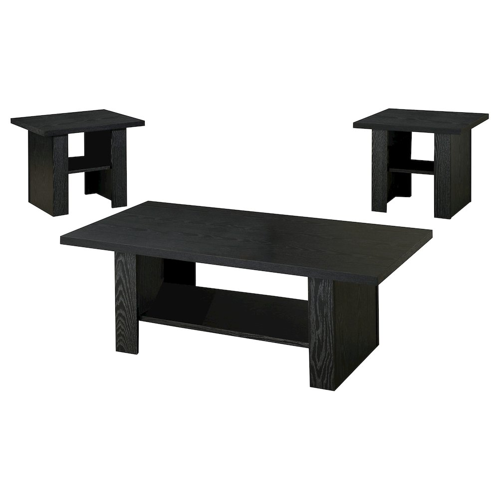 Chic, modern three piece occasional set with a cool, contemporary feel Bold, black finish adds depth to a living room Lower shelf provides ample storage space
