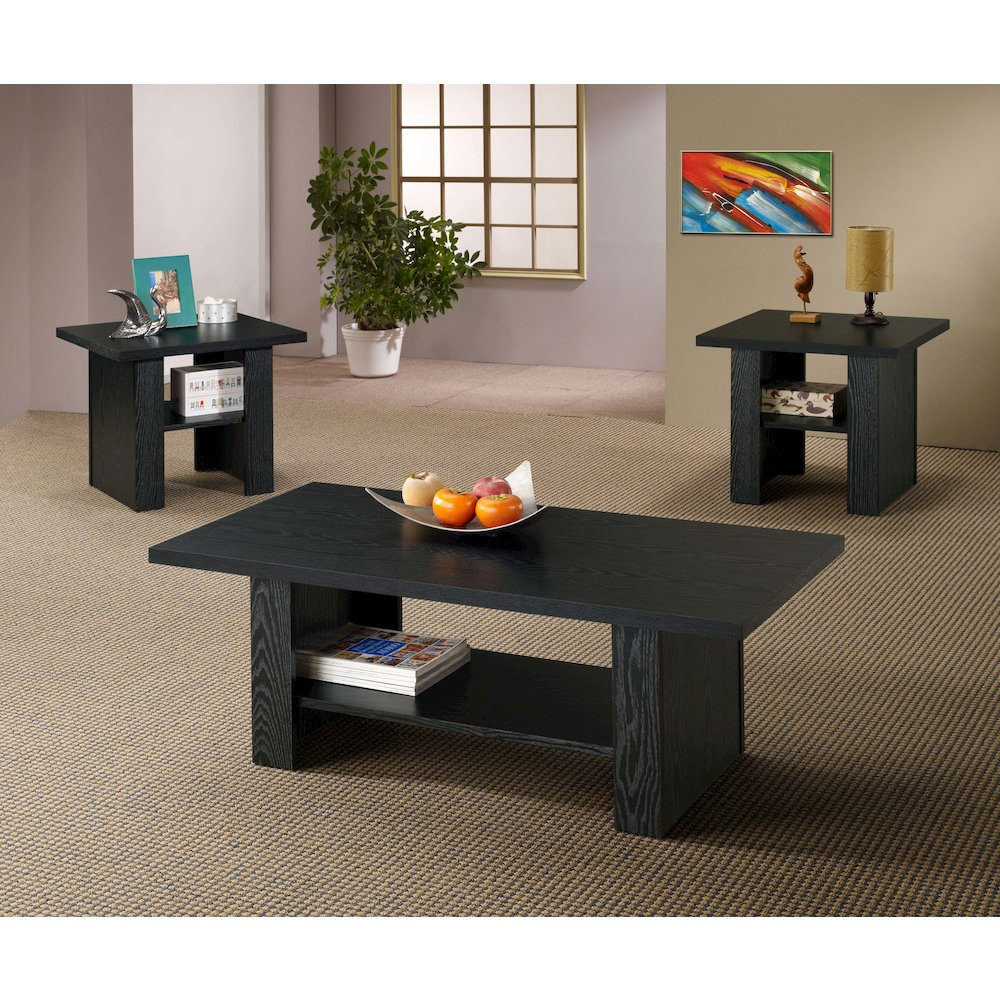 With three elegant furnishings to enhance your home, this set of tables is fashionable and functional. Each includes a convenient lower storage shelf for books, magazines, or anything else you may choose. Clean, classic lines finished in a rich black pull a room together in style. It adds glamour and versatility to any den or living room's seating arrangement. This three-piece set includes a rectangular coffee table and two square end tables.
