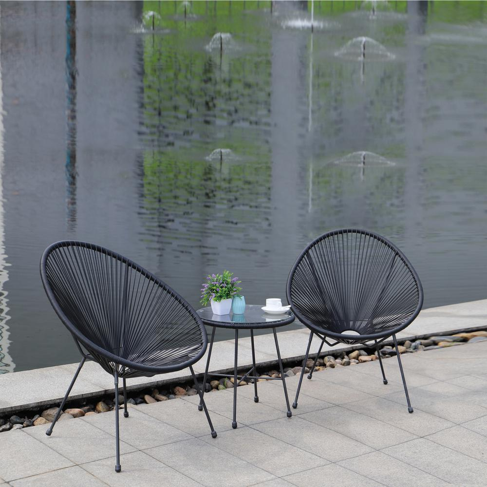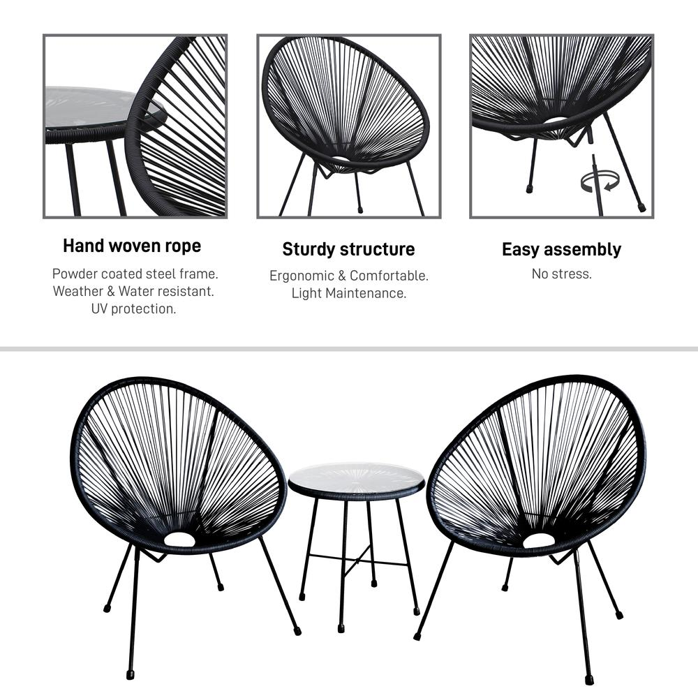 Hand-woven rope and powder coated steel frame Set includes two chairs and one coffee table UV protected, weather and water resistant Ergonomic and sturdy structure with a modern sleek design that provides superior comfort 5mm glass tabletop with suction cups included Easy to assemble, no stress Comfortable lounge seating with a weight capacity of 280lbs per chair Perfect for front porch décor, patio chairs, balcony set and pollside seating Product care: Clean using soap, water and a soft cloth Seat Height: 16'' inSeat Depth: 17.75'' in Ships in 1 Box